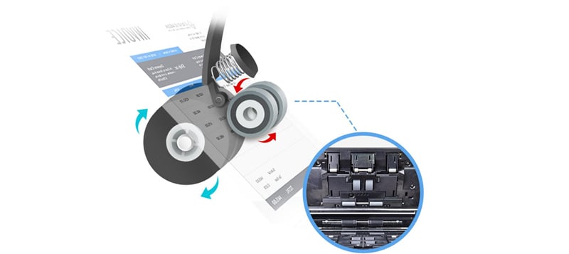 众所周知,一份案卷中可能会有很多大大小小不同的尺寸的证据,比如发票、合同、小票、证件、A4文件等。这时候如果分开扫描无疑是非常浪费时间的。为了提高工作人员的效率,PT2160采用了复合式导纸夹设计,可以容纳多种尺寸文件混合扫描,有效改善了传统扫描仪在扫描过程中因纸张歪斜导致卡纸的情况发生。